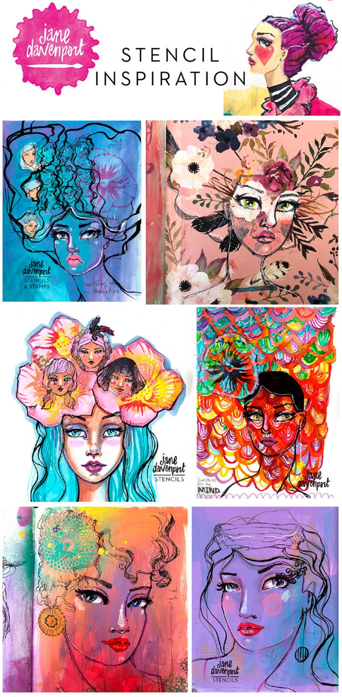 My artwork in stencil form creates the perfect foundation for learning how to draw faces, as well as using them for wonderful layering in your mixed media project.