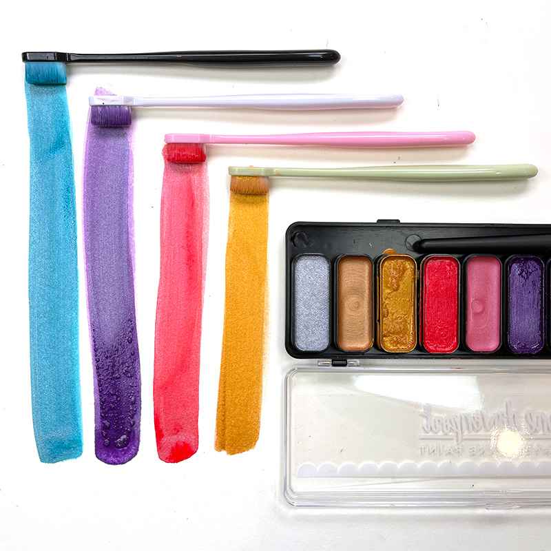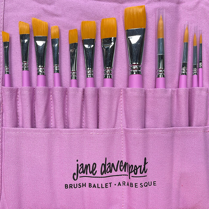 There are 12 brushes in the Arabesque set and each one features a durable Japanese nylon bristle that is not only cruelty-free, but full of bounce for the most pleasant painting experience. For easy reference, conventional sizing as well as the type of brush is printed on each brush. You will also find the letter "A" to remind you that these love Acrylic paint!