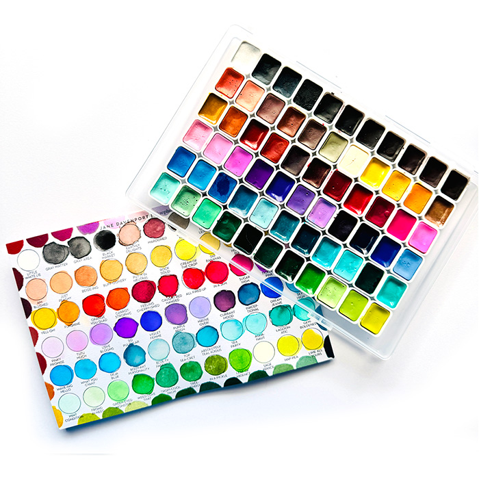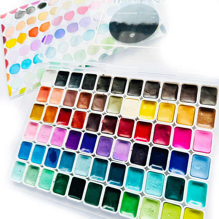 There are two formulas in the paintbox and you may notice that some colours appear glossy and others are more matte (no shine). You may notice that the matte colours have a little more opacity to them and take an extra moment to activate. They have good covering strength! The glossy colours are a transparent type of watercolour that remains a a little soft, and makes it better for mixing and staining. The glossies will usually look flatter in the pan as they settle differently after the hand pouring process, because they are more concentrated.